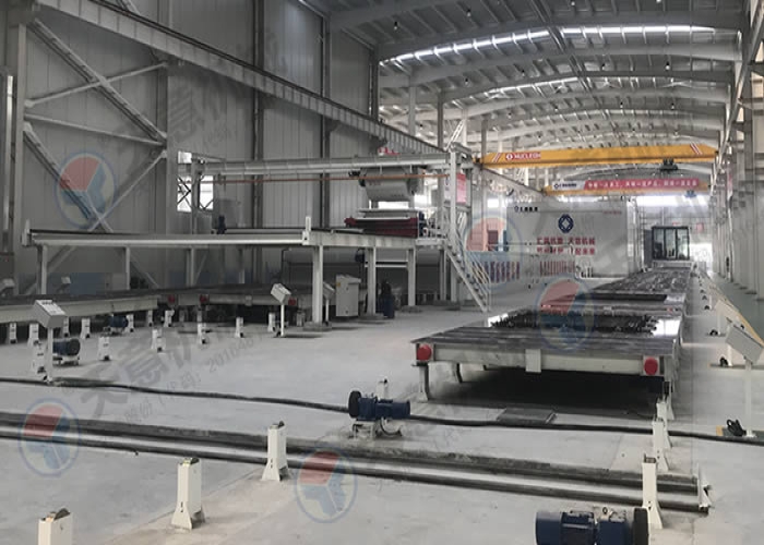 PC環(huán)形疊合板生產(chǎn)線采用高精度、高結(jié)構(gòu)強(qiáng)度的成型模具,經(jīng)自動布料機(jī)把混凝土澆筑其中、振動臺振搗后并不立即脫模,而是經(jīng)預(yù)養(yǎng)護(hù)、蒸汽養(yǎng)護(hù),使構(gòu)件強(qiáng)度滿足設(shè)計(jì)強(qiáng)度時(shí)才進(jìn)行拆模處理,拆模后的成品構(gòu)件運(yùn)輸至成品暫存區(qū)或室外堆場,而空模臺沿輸送線自動返回,形成自動化環(huán)形流水作業(yè)。
