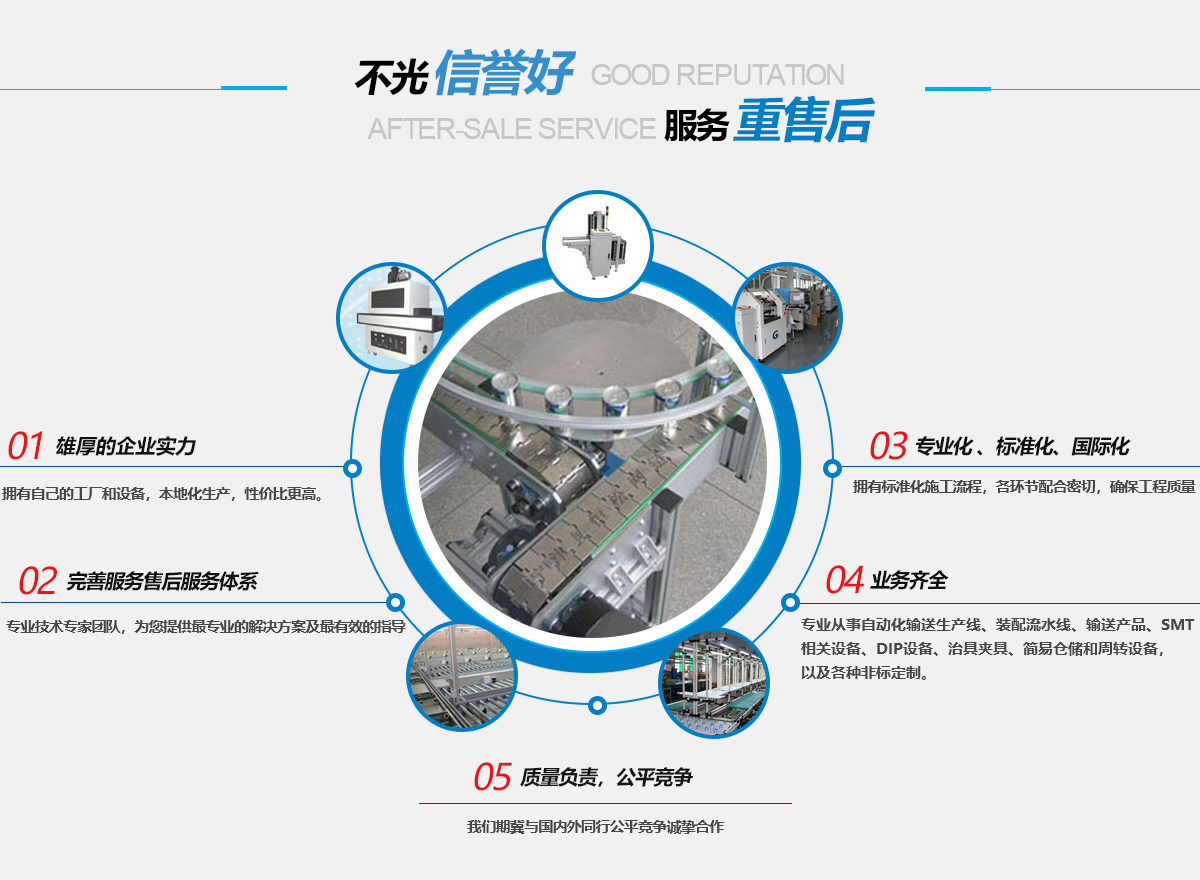 我公司致力于電子、工業(yè)新技術(shù)推動(dòng)的新產(chǎn)品工藝的設(shè)備配套,專(zhuān)業(yè)從事自動(dòng)化輸送生產(chǎn)線(xiàn)、裝配流水線(xiàn)、輸送產(chǎn)品、SMT相關(guān)設(shè)備、DIP設(shè)備、治具夾具、簡(jiǎn)易倉(cāng)儲(chǔ)和周轉(zhuǎn)設(shè)備,以及各種非標(biāo)定制.....